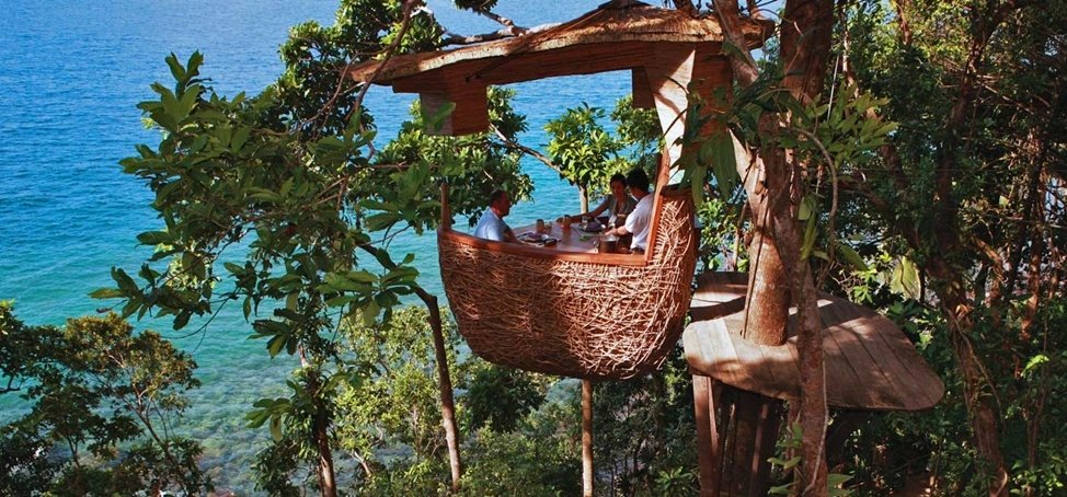 В пятизвездочном отеле в Таиланде можно пообедать на верхушке дерева. Владельцы отеля придумали уникальный ресторан. Они закрепляют большие плетеные корзины на местных экзотических деревьях и поднимают их на высоту четырех с половиной метров над землей. В этих корзинах - гнездах стоят столы и стульчики - можно хорошо пообедать. Официанты обслуживают гостей, добираясь до них с помощью специальных канатных дорожек.